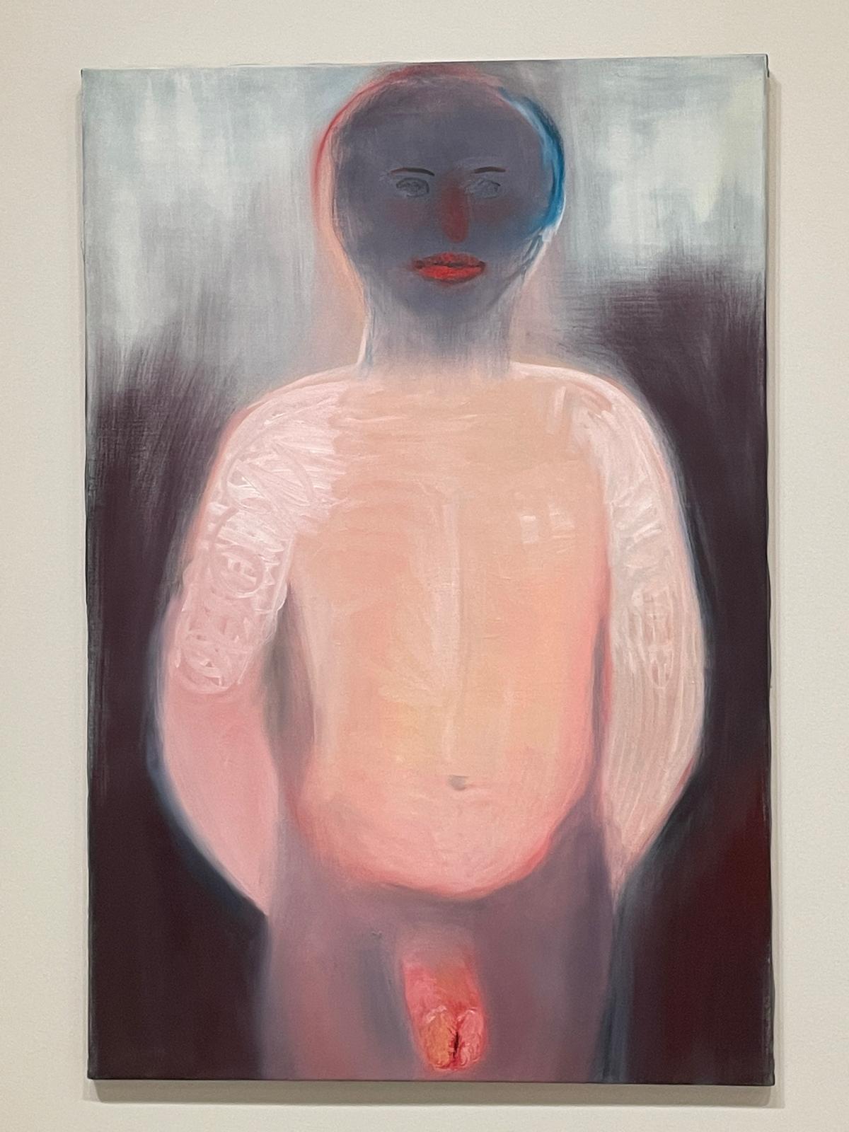 Installation de plusieurs peintures de l'artiste Miriam Cahn dans une salle de la Bourse de Commerce